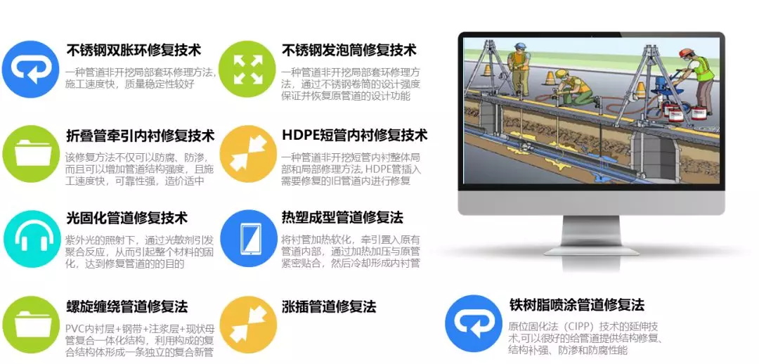城市管網健康程度決定了管網能否正常運營,因此對于管網診斷后的修復,需要大量的技術儲備,萬朗集團經多年研究,對于各種工況下、不同管徑、不同斷面的排水管道,可采取以下9種修復技術: