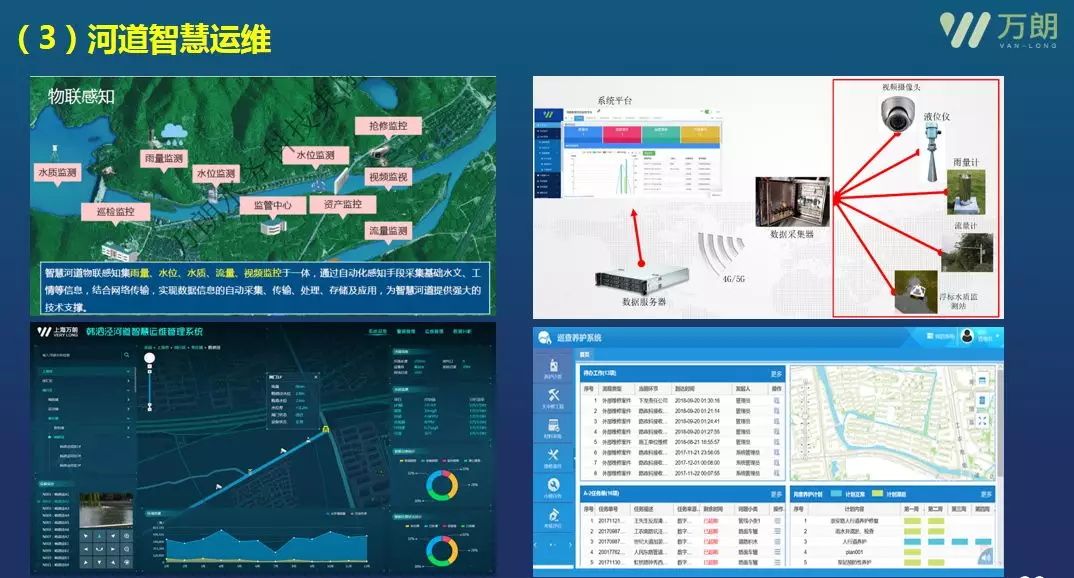河道智慧運維是一種集雨量、水位、水質、流量、視頻監控于一體,通過自動化感知手段采集基礎水文、工情等信息,結合網絡傳輸,實現數據信息的自動采集、傳輸、處理、存儲及應用,為智慧河道提供強大的技術支撐。萬朗智慧河道運維方案,充分運用物聯網、互聯網、BIM+GIS、視頻行為識別、大數據等技術,從與河道運維相關的智能視頻監測、河道綜合監控、巡檢養護、應急搶修、資產管理、公眾參與等六個方面針對河道運維實現全面監測監控實時化/管理協同化、決策科學化、處理主動化。為實現河道水環境的長效改善提供高效率的智慧運維平臺。