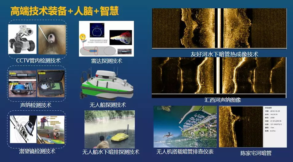 溯源診斷案例:閔行淀南片區100多平方公里,141條河道、181個小區、477個沿河排口;基礎數據在排查階段即錄入數據庫,通過建模分析,為項目方案制定提供依據。診斷排查采用的技術:一個是高端技術裝備+人腦+智慧,即用最先進的設備,配上專業的人士加上智慧的手段;另一個核心技術就是排水模型構建,基于基礎數據,不同類型的排水系統采用不同的建模分析,為診斷方案提供依據。