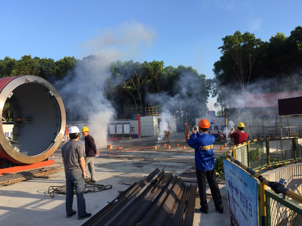 2015年8月6日上午6點,閔奉支線C2標JPCCP管頂管施工正式開始,現正在磨削頂管井洞口加固區。閔奉支線14#井——15#井的JPCCP管頂管開始正式頂進施工。晨光曦曦,煙花紛飛,在經歷一年多的潛心研究和試驗,JPCCP管大口徑頂管新工藝、新材料的試驗研究成果終于在這一天開始進行現場實踐。 在JPCCP管頂管試驗段的新長征路上,我們JPCCP管試驗團隊將一起努力!